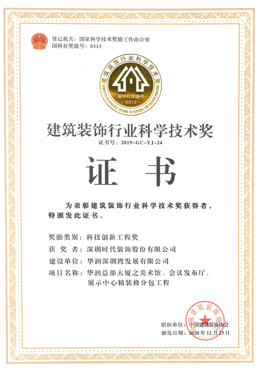 華潤總部大廈之美術館、會議發(fā)布廳、展示中心精裝修分包工程位于中國華潤大廈地下一層。時代裝飾在該項目施工過程中創(chuàng)造性地應用了十余項“四新技術”。