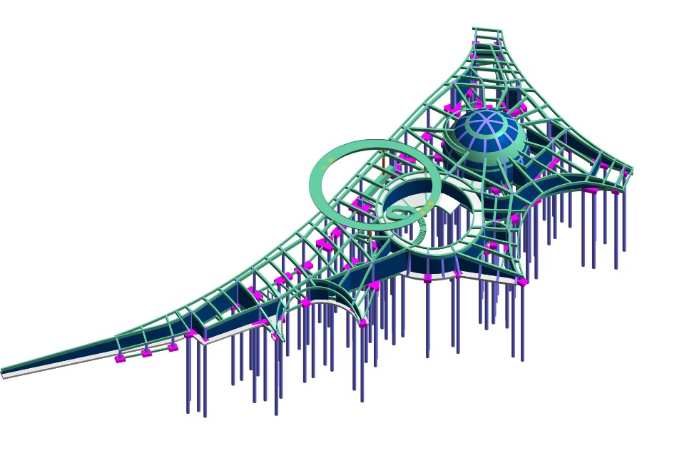 “碧道之環”主入口墻面、中心環梯眺臺及無界劇場是碧道之環的重難點部分,我司在該部分采用大量裝配式施工方案,根據圖紙及現場實際情況提前下單,現場裝配安裝,以縮短工期,保證高質量施工。