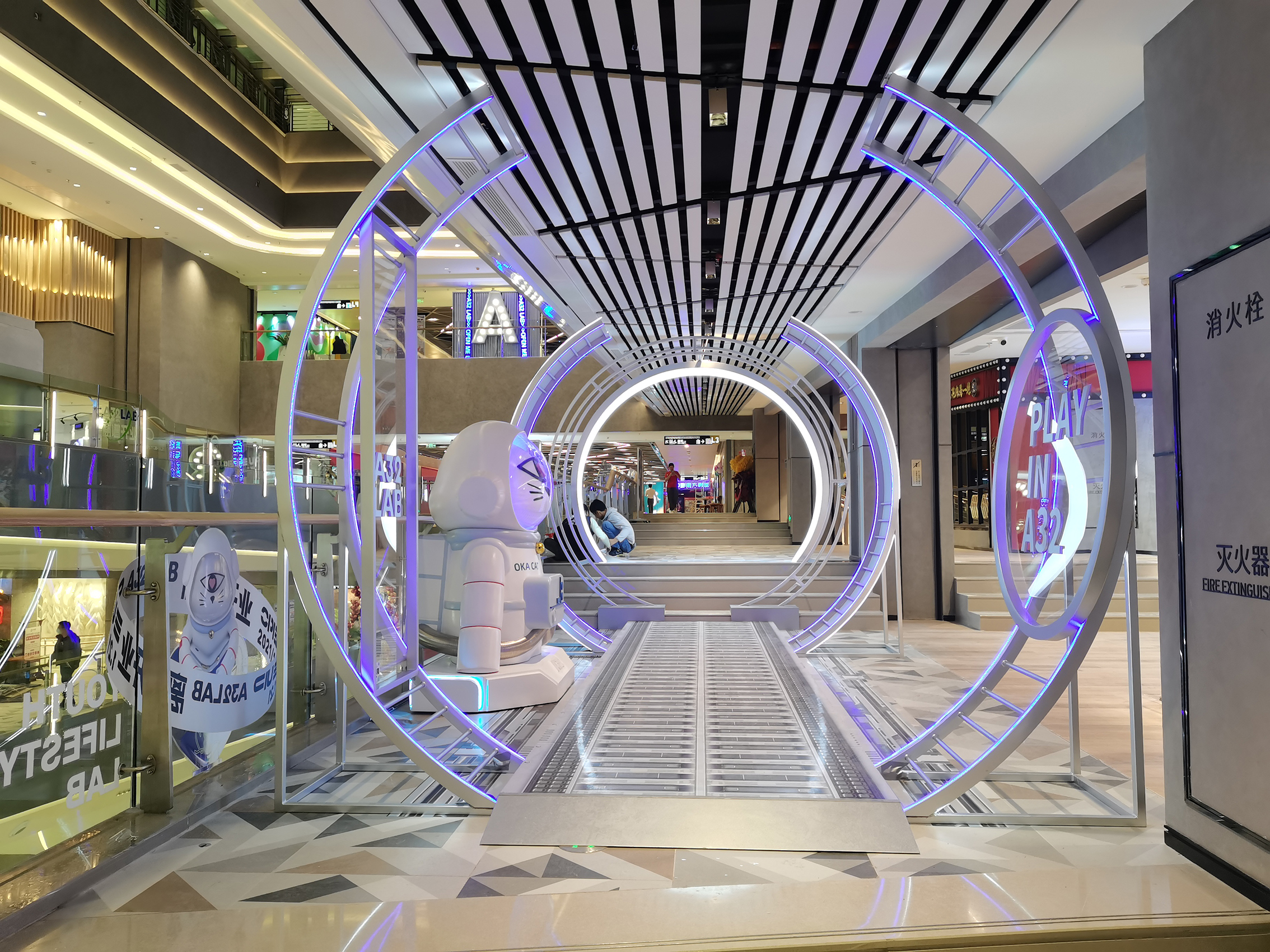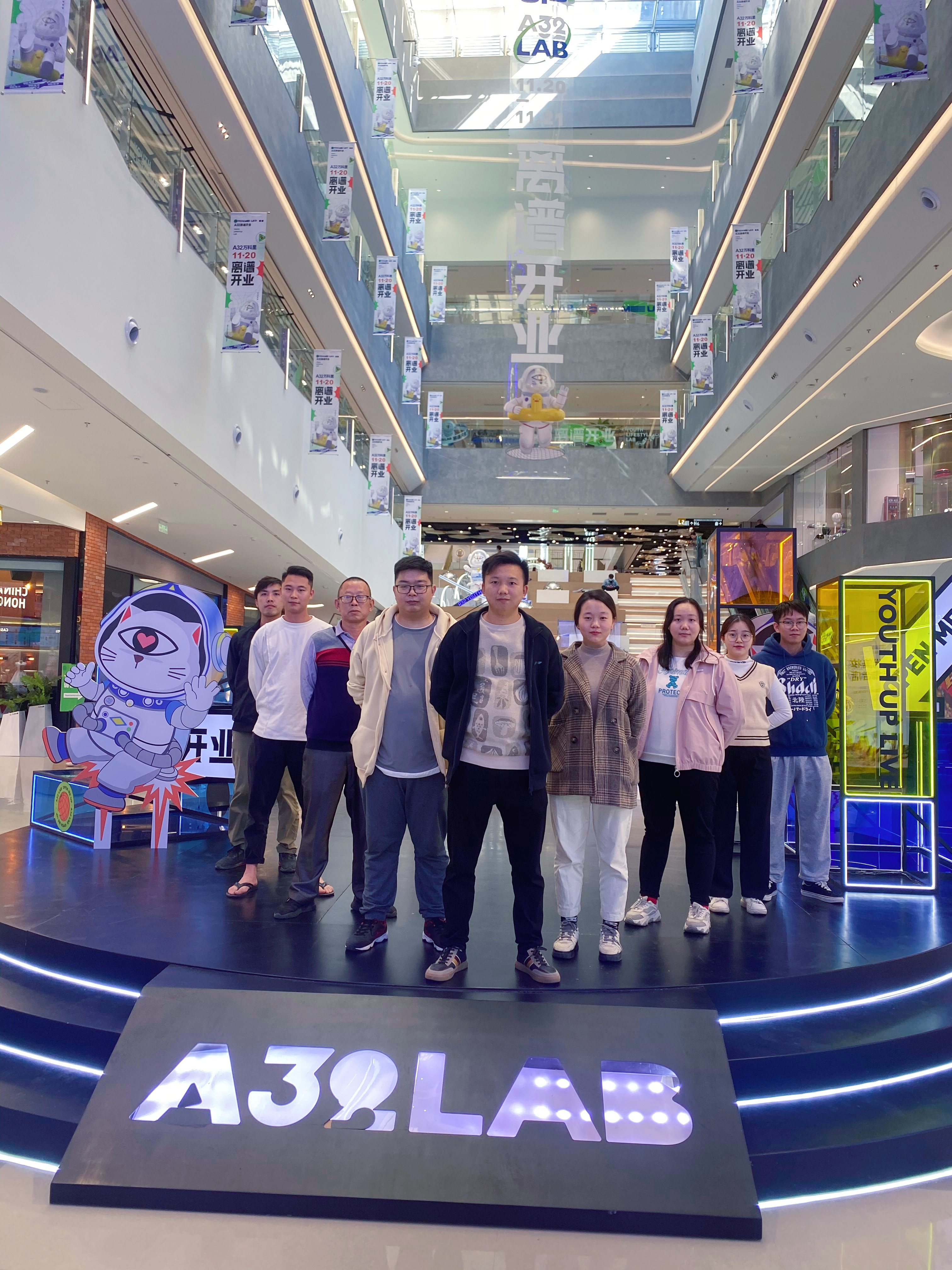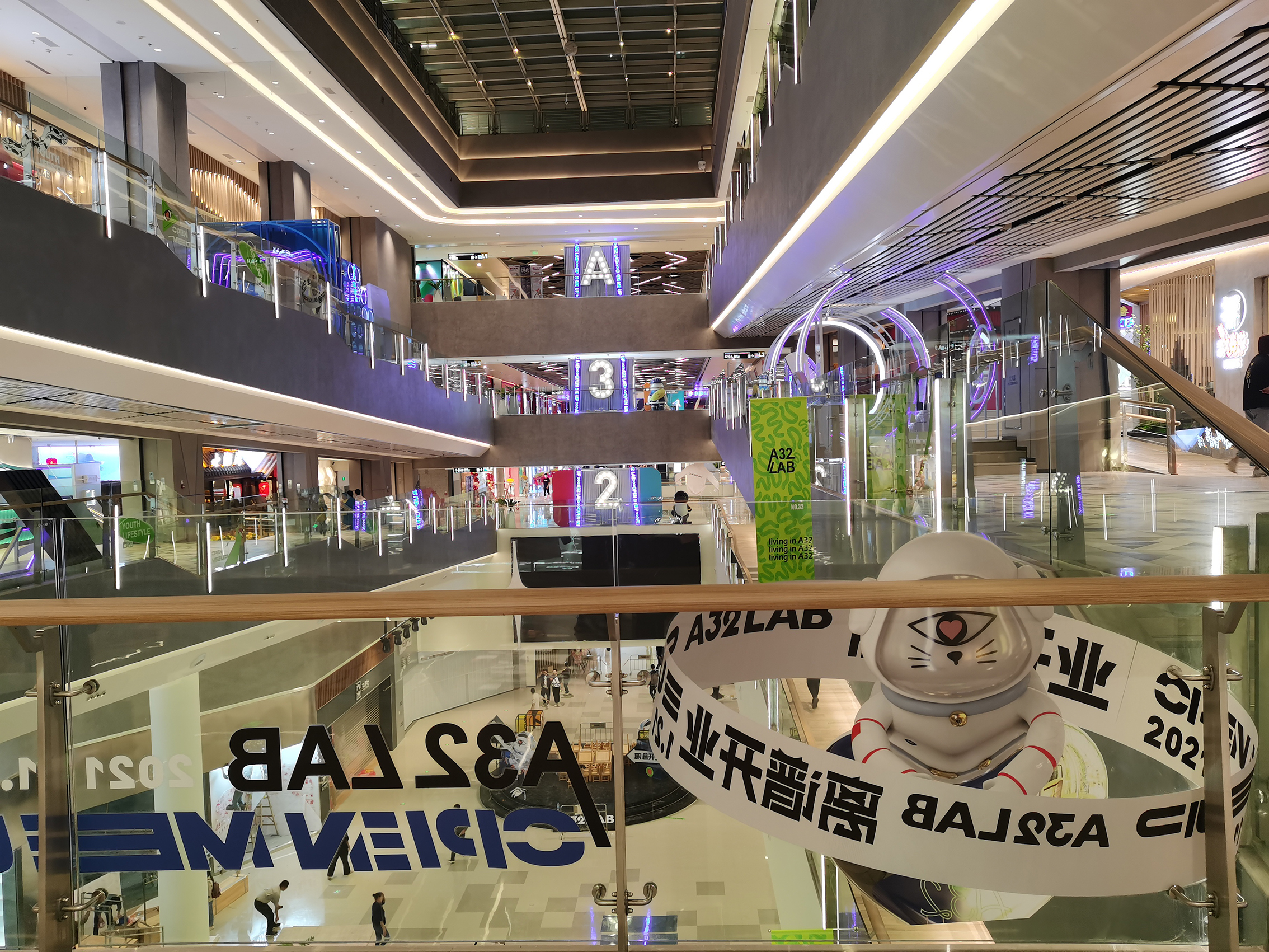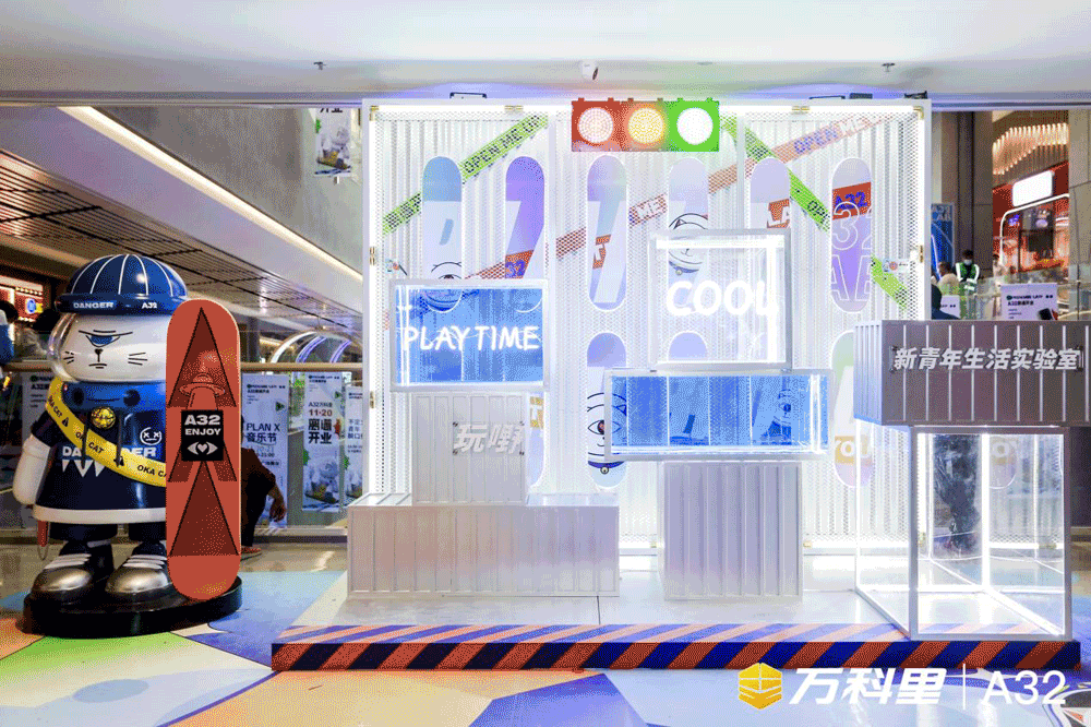 A32在建筑空間上極具特色,擁有“3+1”主題空間——開放式中庭“共享階梯“、“螺旋步道”、“旋轉(zhuǎn)空間”和“花時(shí)間主題街區(qū)”,同時(shí)結(jié)合A32的潮玩IP形象,打造“失重時(shí)空”、“32號(hào)空間”、“無差別Lab公共藝術(shù)展”三大主題展覽,呈現(xiàn)出感官與視覺的雙重盛宴。