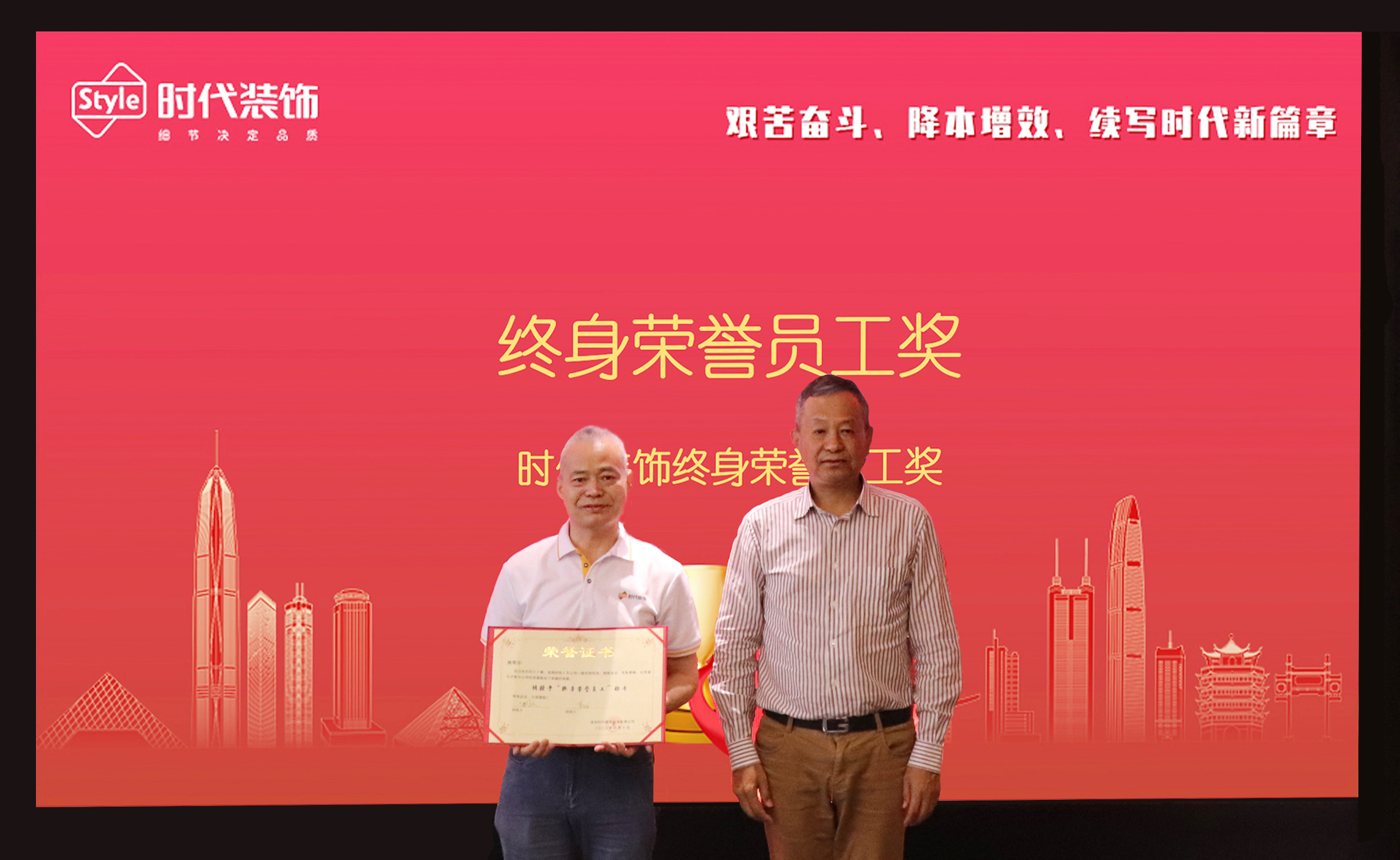 在表彰環節最后,公司頒發了最重量級的獎項——“終身榮譽員工獎”。獲獎者在30多年前就追隨公司創始人一起打拼事業,他們見證了時代創立、起步、發展的每個階段。三十多年來,他們輾轉全國各地,足跡遍布大江南北,在公司戰略布局下指哪打哪,披星戴月,他們忠誠、踏實、刻苦、任勞任怨,是時代文化的最好代言人。